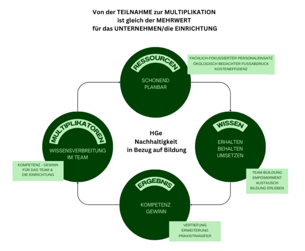 Unser Anliegen: Ressourcen der Einrichtung können durch fachlich-fokussierten Personaleinsatz der Teilnehmenden optimiert werden, wie auch eine Kosteneffizienz durch interne Implementierung und Verbreitung von Wissen, was in Folge Qualitäten steigert sowie einen ökologisch- bedachten Fußabdruck sind nur einige Faktoren daraus. Das erworbene Wissen selbst ist ein Kompetenz-Gewinn für die Person, das Team sowie die gesamte Einrichtung.